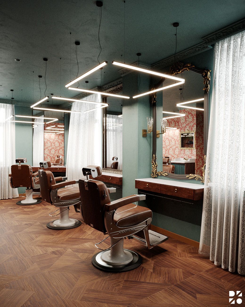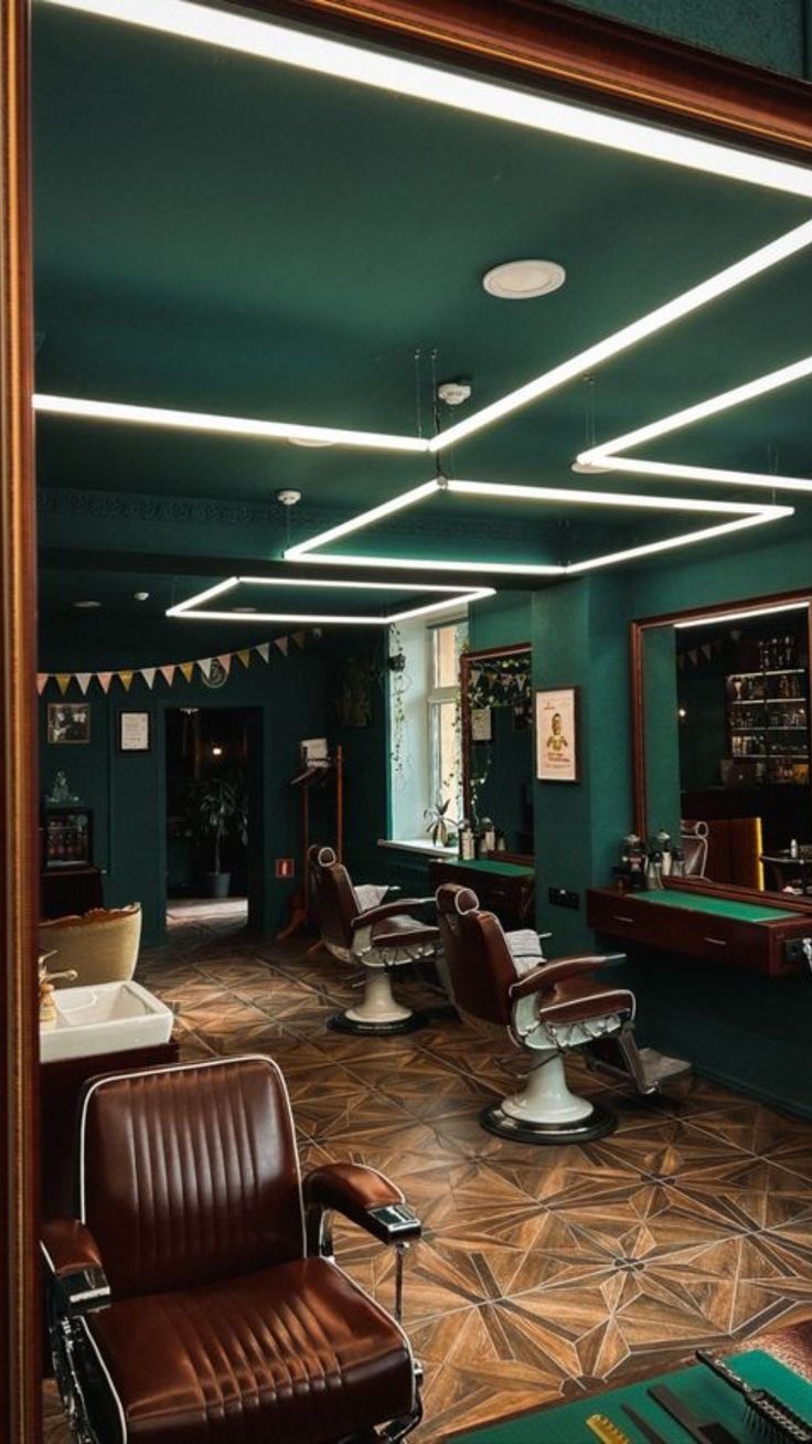 - Площадь барбершопа 50 м². Уникальный интерьер с дорогой мебелью под заказ.