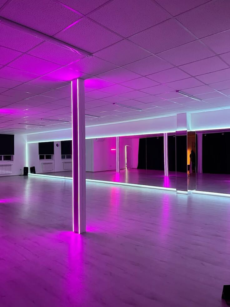 Продуманный современный дизайн помещений (два отдельных зала для занятий 65 кв.м. и 32 кв.м.), 2 раздевалки с душевыми, детская зона, ресепшен, санузел, вайфай. Залы оснащены всем необходимым: зеркальные стены с подсветкой, музыкальное оборудование, пилон, гамаки, коврики, резинки, подушечки, мячики, ролики, вентиляция.
