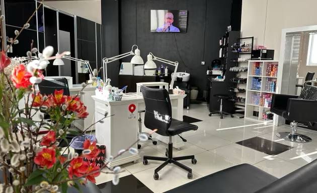 В студии есть: ресепшн, зона ожидания, парикмахерский зал, зона маникюра, комната педикюра, сан. узел, подсобное, комната персонала с кухней.