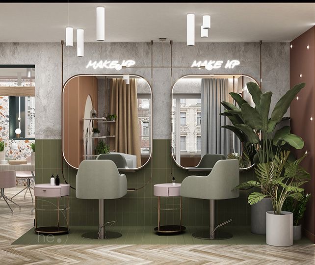 Салон разделен на зоны: ресепшен, солярий на 1 место, кабинет маникюра и педикюра на 3 рабочих места, 2 кабинета косметологии, парикмахерская на 3 рабочих места, гардероб, душевая.