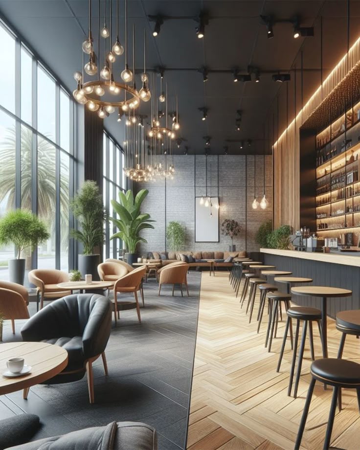 - Кафе расположено на первом этаже, с отдельным входом и панорамными окнами.