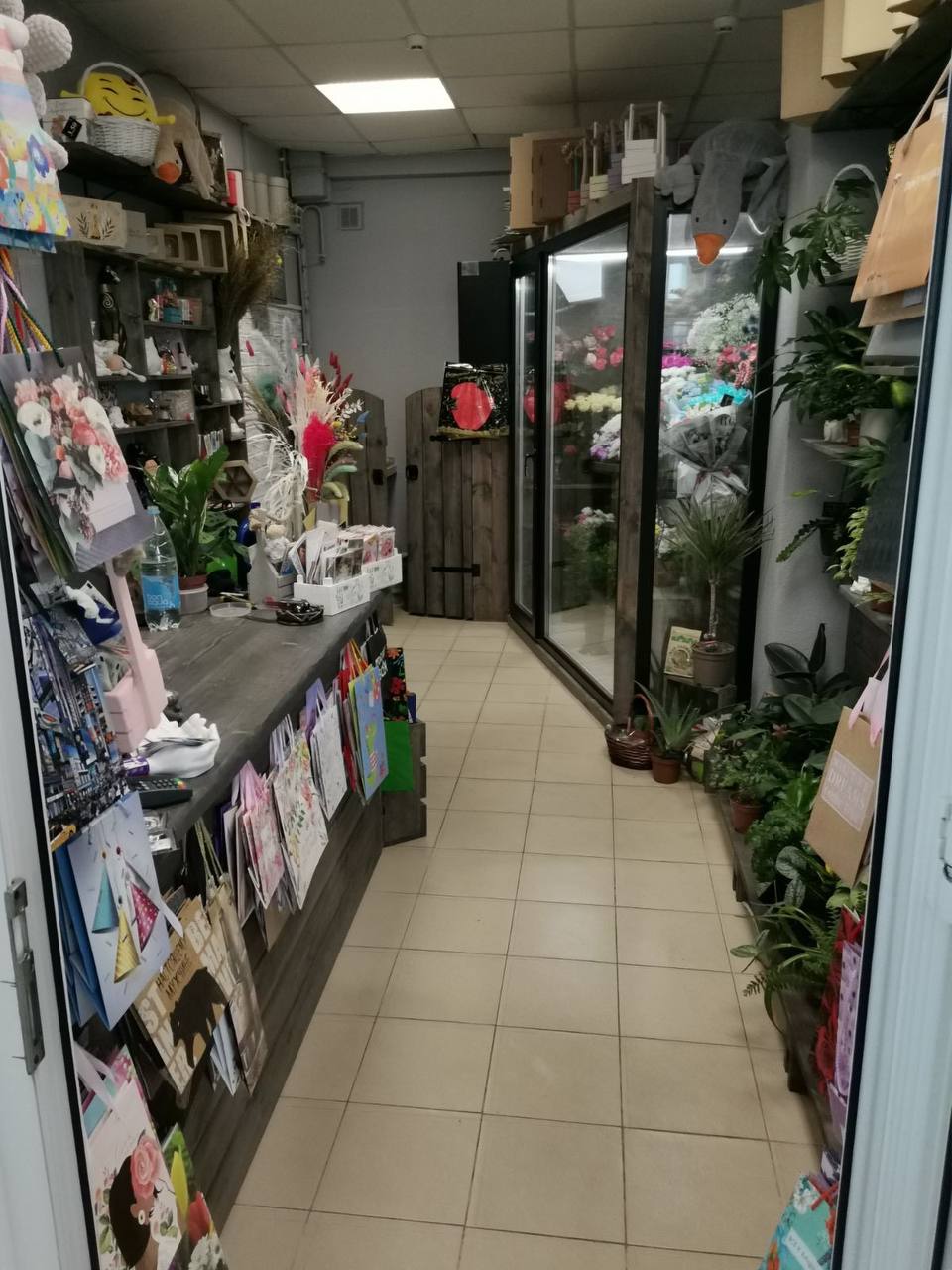В магазине большой выбор цветов, есть сувенирные подарки.