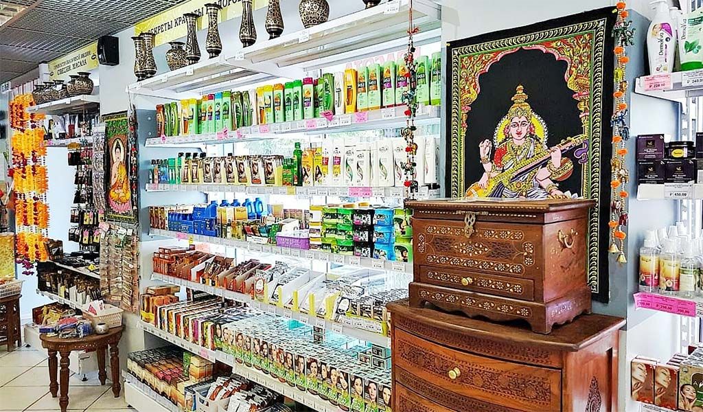 Есть широкий ассортимент различных товаров: препараты для здоровья, красоты, средства по уходу за волосами, различная парфюмерия, благовонии, индийские продукты питания и специи, чай и кофе.